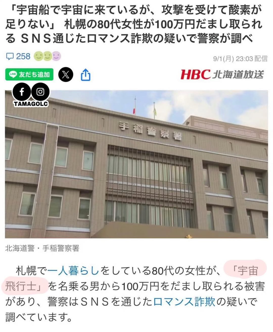 結果答案是「有」,剛剛在北海道發生的一宗詐騙案。