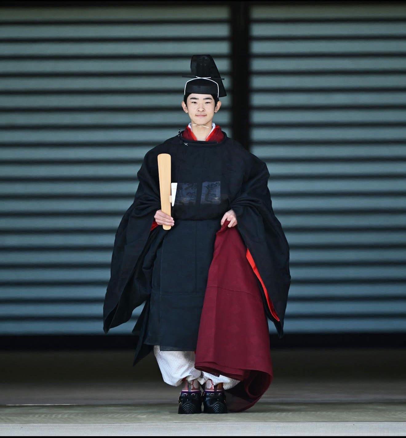 完成加冠儀式後,悠仁換上 黑色的「縫腋袍」(ほうえきのほう),這是成年皇族的正式禮服。黑色象徵莊嚴、責任與成熟,標誌著身分轉變。兩者的顏色與形式差異,正是由「未成年 → 成年」的過渡象徵。🫢悠仁意想不到地適合穿古裝「縫腋袍」。這個「右手握『笏(しゃく)』,左手中指或兩三指輕壓衣襬(其實是衣服的拖尾)」的動作,是古代公卿式樣的正規姿態哦哦哦哦~~~