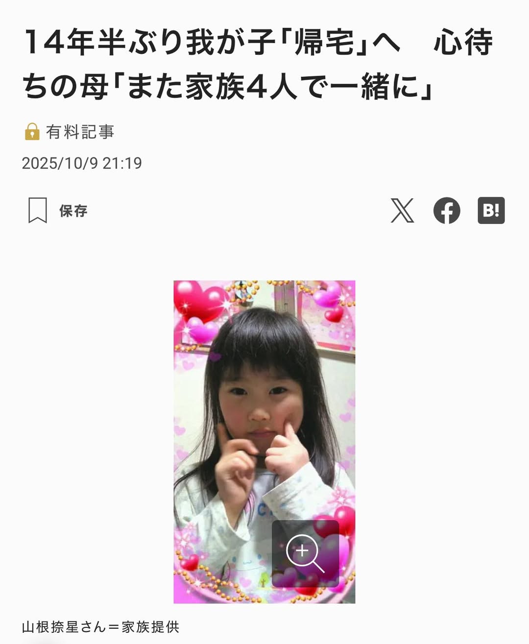 2025年10月,岩手縣山田町的女孩子,山根捺星(當時6歲),在2011年東北大地震之後,終於「歸家」。她的下顎骨於去年(2023年)在宮城縣南三陸町的工程現場中被發現,經DNA鑑定後,剛剛確認屬於她。家屬表示:「早已放棄了能再收到消息,能確認真的很感激。」