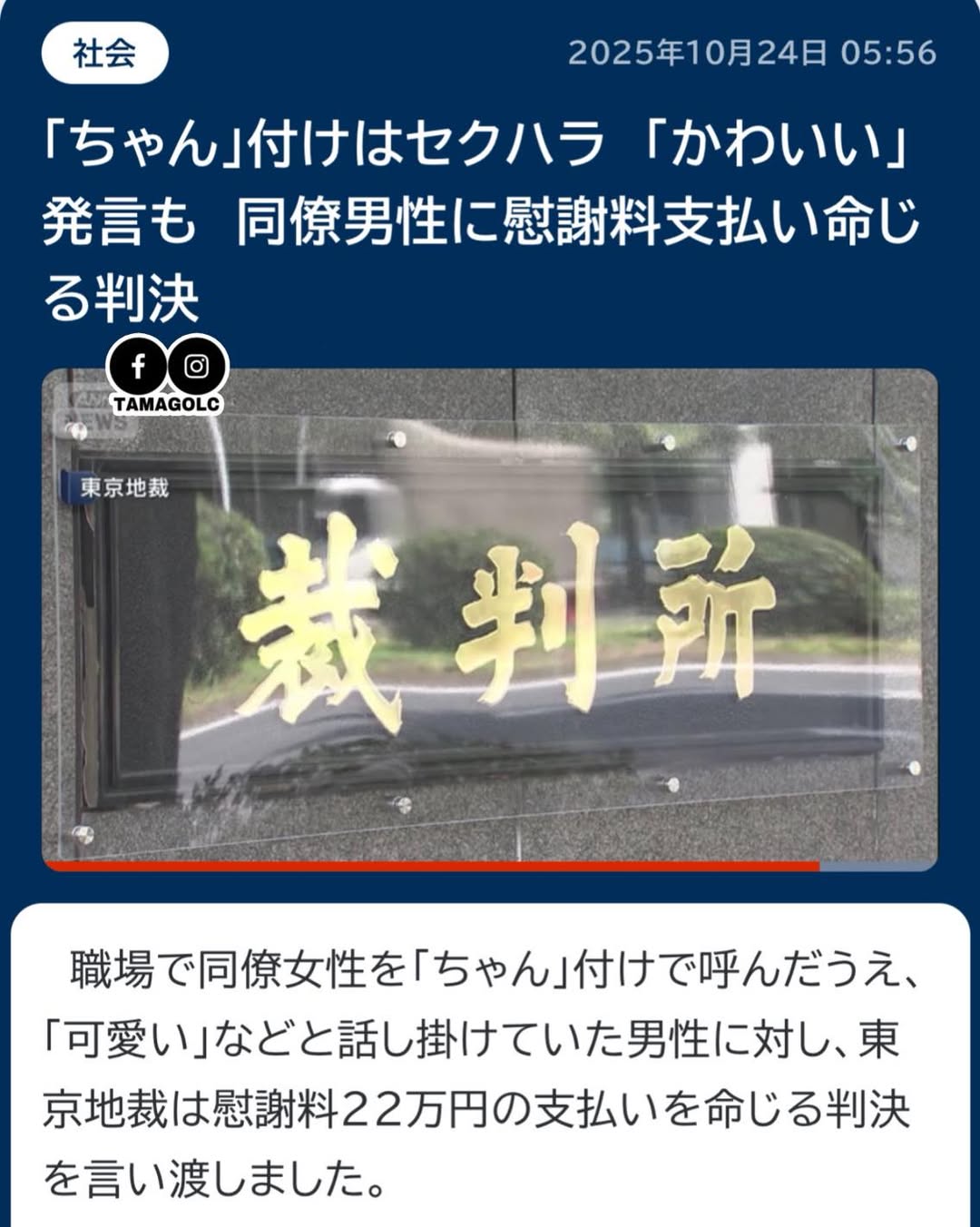 東京地方法院裁決:一名女性員工控告男同事對其言語騷擾(セクハラ),法院認為即使叫「〜ちゃん」,在職場上也不能無視性別與權力關係帶來的壓力。