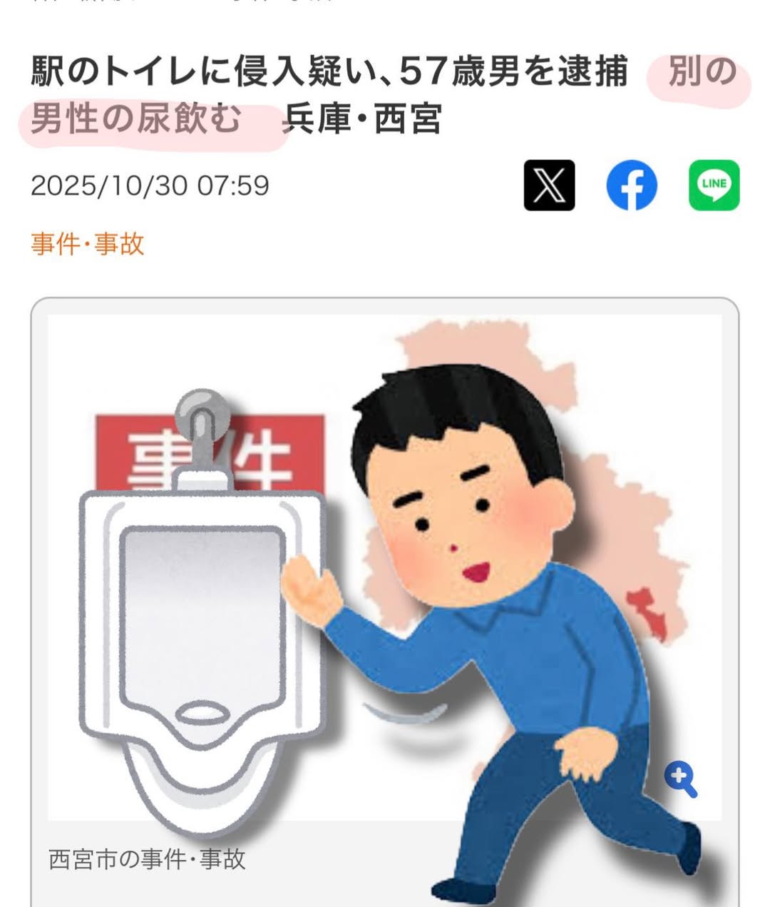 警方表示事件發生於今年9月1日下午4時半左右。該名男子進入阪急電鐵西宮北口站的男性廁所,在一名男子使用尿兜如廁時,突然以手舀取對方的尿液並飲下(😨有冇講「いただきます」?)