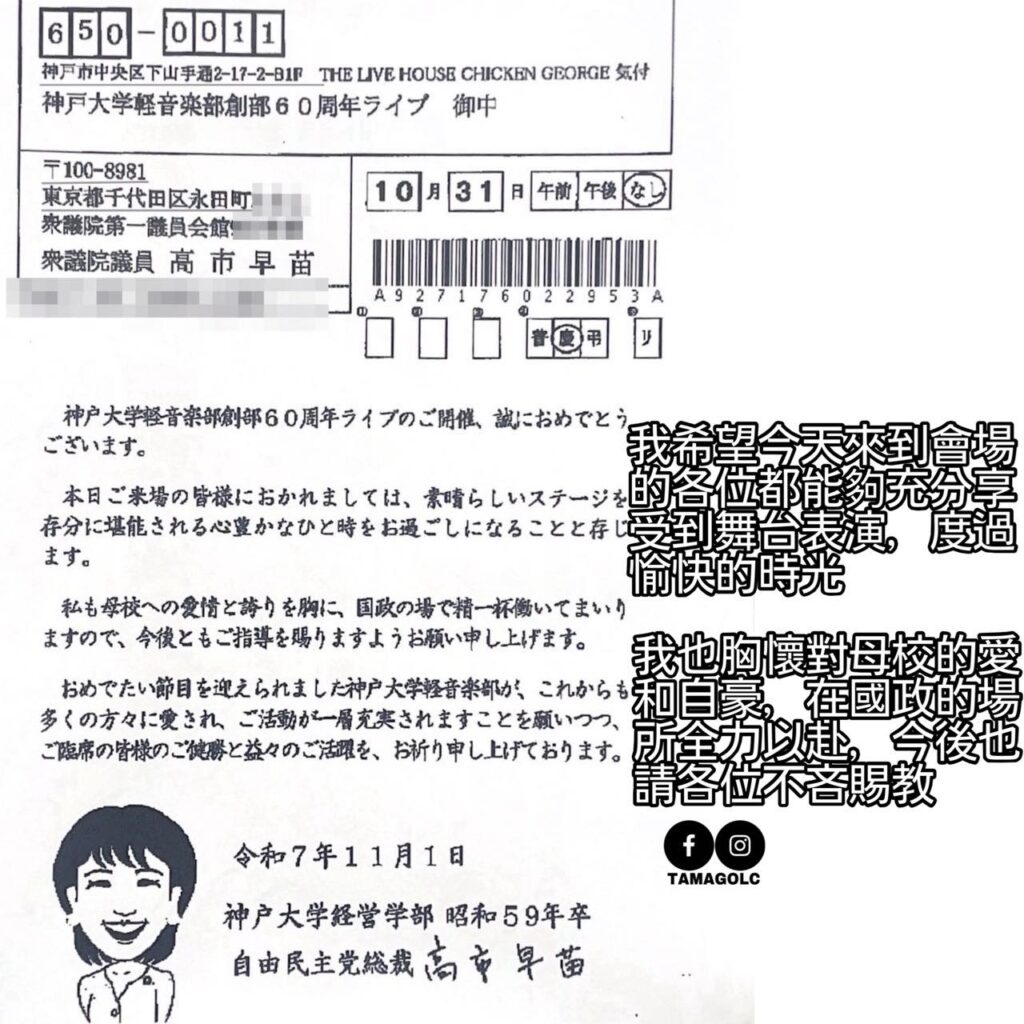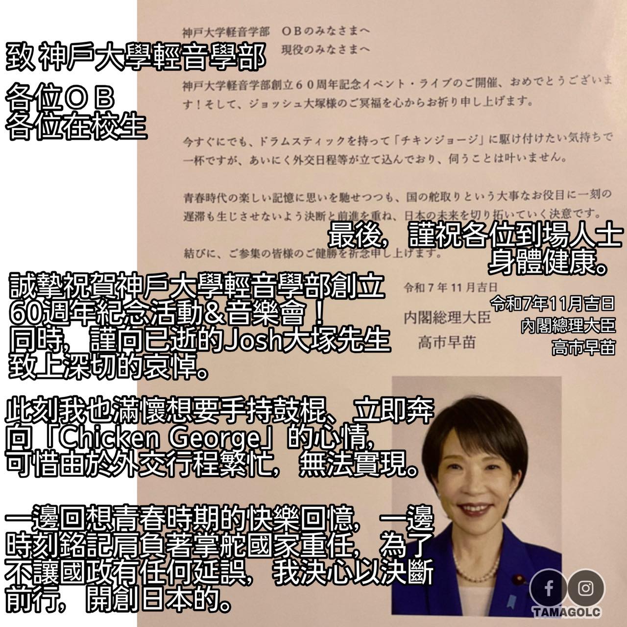 母校神戶大學慶祝輕音樂部60週年的紀念live,演出者和參加者(當然也是她的後輩),全體收到高市分別以作為總理和作為自民黨總裁的學姐身份所發出的祝賀哦哦哦哦!!!