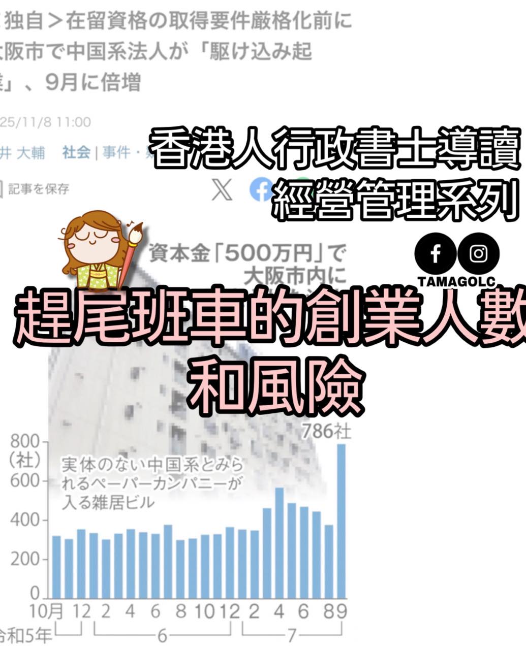 根據最新市場統計,今年9月大阪市內新設立的**法人**數量急增,接近前一個月的兩倍,一共是786間。而調查顯示,其中約4成代表人登記地址在中國。法人數字如果跟經營管理簽證簽證掛鉤的話,也就表示這大約會有314個經營管理簽證申請出現。