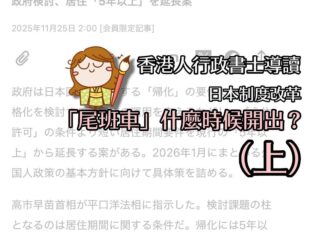 香港人行政書士導讀 《日本制度改革:「尾班車」什麼時候開出》(上) 蛋老師Posted on 26/11/2025 💁🏻♀️香港人行政書士導讀 《日本制度改革:「尾班車」什麼時候開出》(上) 昨天介紹日本的新聞報導有關「歸化… 閱讀更多
