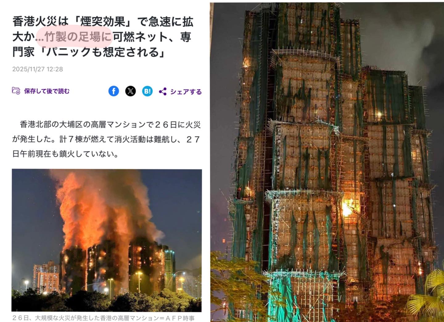 香港での大規模火災に関して、「『竹の足場』が燃えやすいから延焼したのでは」という声をいくつか目にしました。