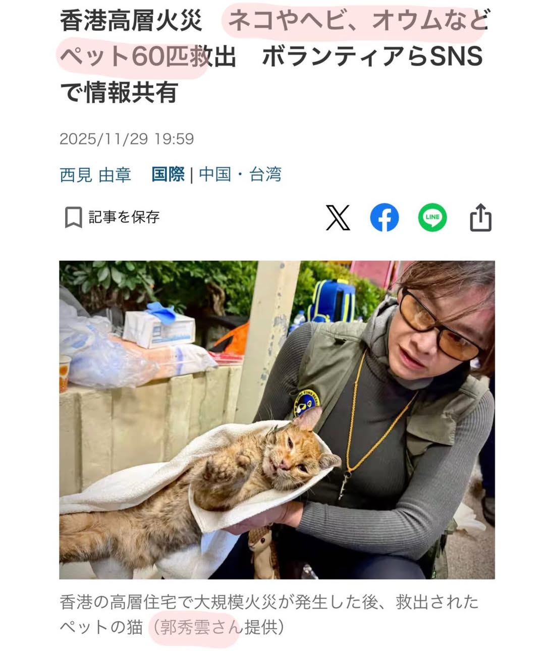 //「家など全てを失った住民たちにとって、家族であるペットが戻れば精神的な助けになる」。郭さんはそう話した。//