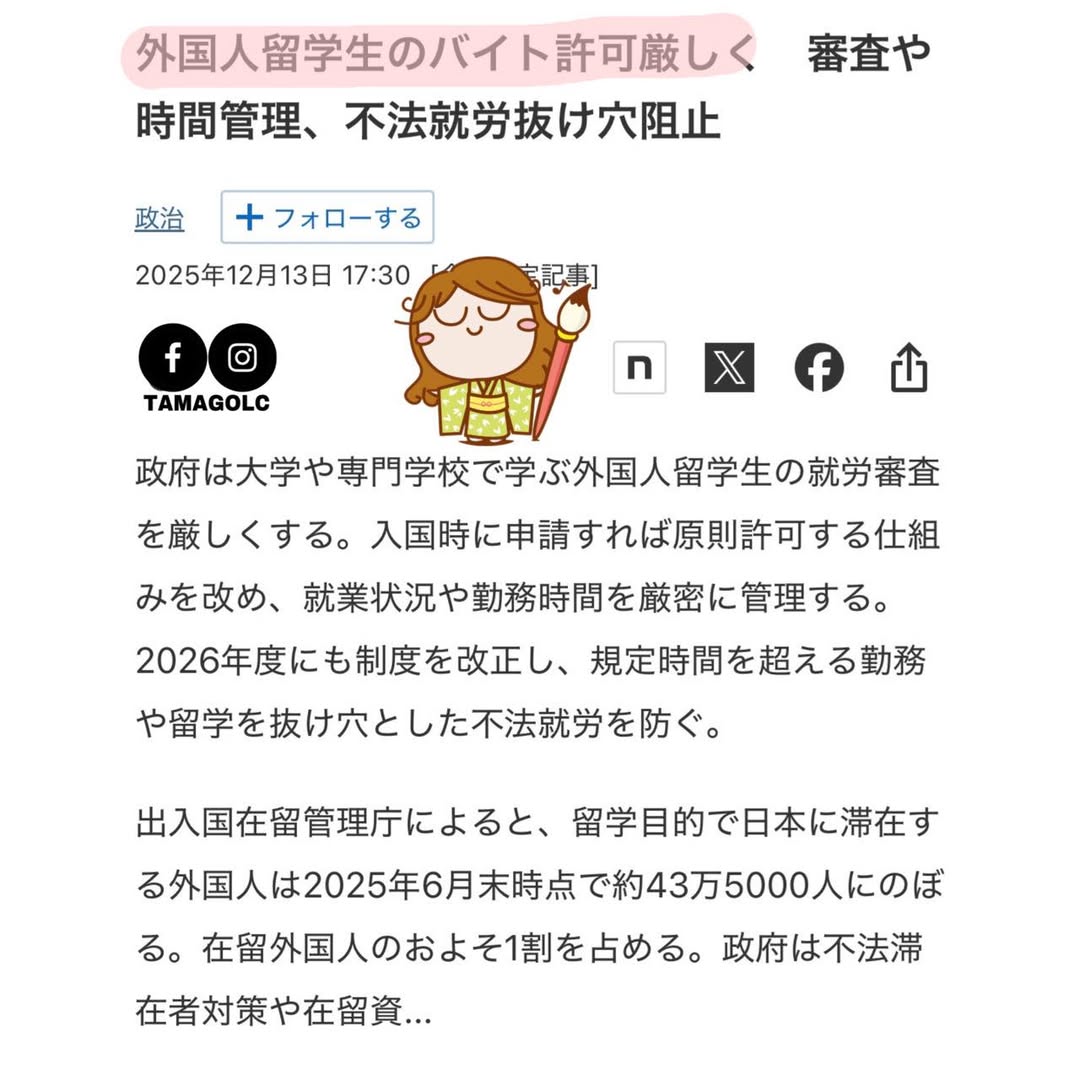 留學生的本分仍然係讀書,其餘活動屬於輔助。政府開始認真回到自己原本寫好、但過去較少嚴格運用的制度設計…尤其當留學簽證已經佔在日外國人的大概10%(43萬人)的時候。
