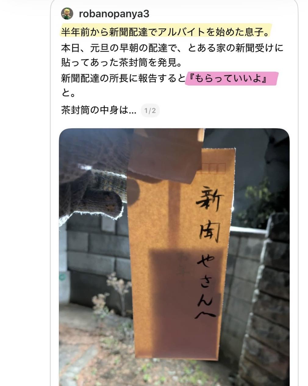 //「半年前開始兼職派報紙的兒子。今天元旦清晨派遞時發現其中一家客戶的收件箱貼了一個啡色信封。