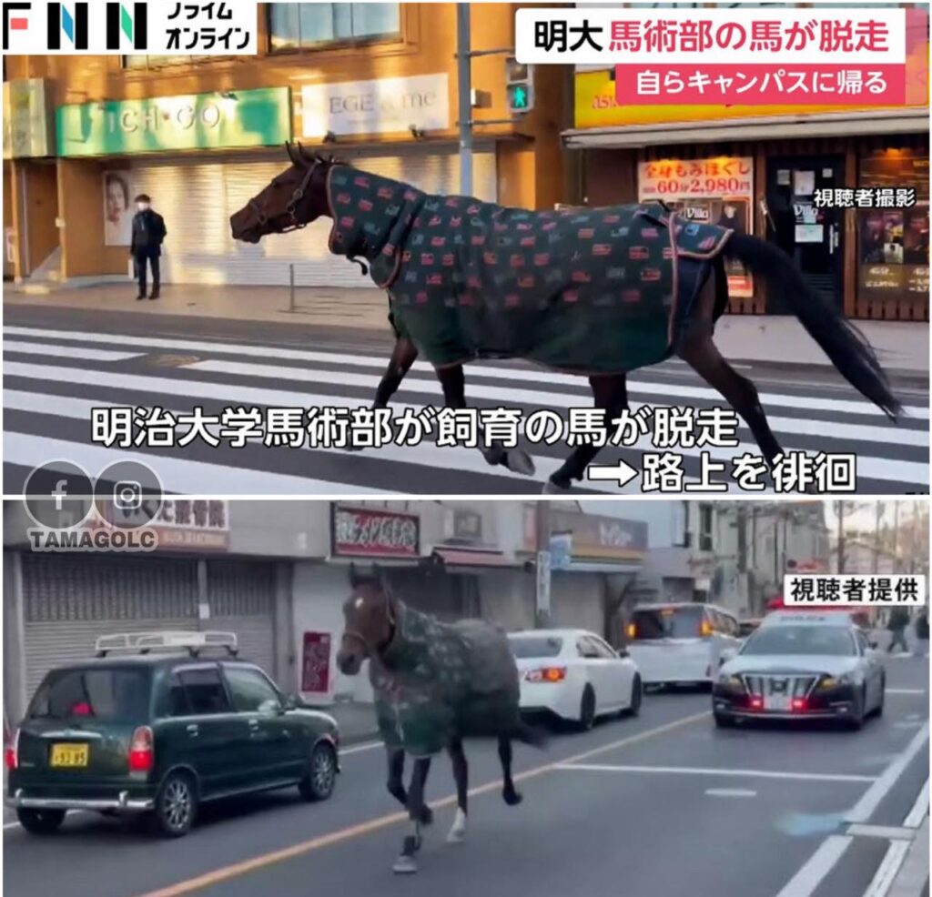 其後證實,該馬匹屬於附近的明治大學馬術部,在警察誘導下,駿馬在馬路上徘徊約半小時後便自行返回學校校舍。
