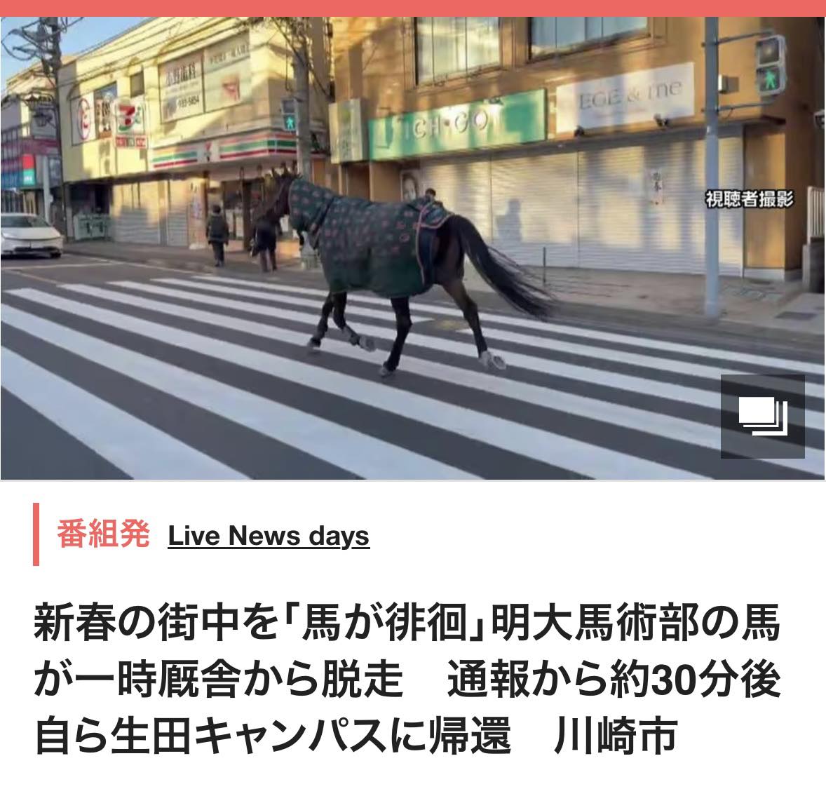 早上7點半川崎市市民發現一匹馬在馬路徘徊。