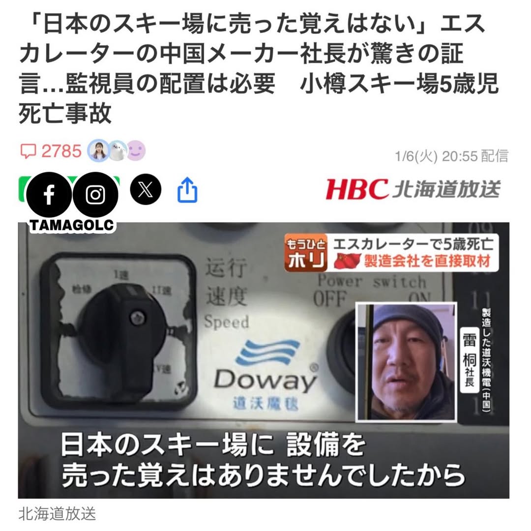 去年年底,在北海道小樽的滑雪場發生5歲幼童死亡事故後,確認出營運公司所使用的扶手梯為中國製,於2019 年安裝完成。日本媒體JNN向中國河北省採訪製造商「道沃機電」(機器上有他們公司的LOGO)的社長雷桐先生,雷先生說「看到事故畫面中出現自家公司LOGO時覺得『很不可思議』,因為他不記得產品曾經賣給過日本的滑雪場。」