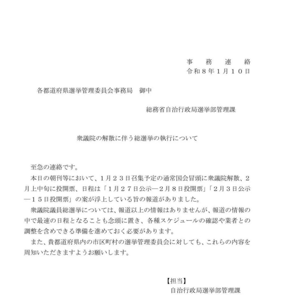 目前總務省已向各地選舉管理委員會發出事務連絡,要求假設「通常國會冒頭即解散眾議院」的情境,提前進行選舉準備。所以雖然未正式宣布,但在行政系統內已經開始準備1月23日的進程。