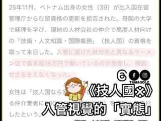 香港人行政書士導讀 技人國|入管視覺的「實態」 蛋老師Posted on 25/01/2026 💁🏻♀️在留資格逐個睇 01 技人國|入管視覺的「實態」 ◎ 技術・人文知識・國際業務 日本工作簽證的一種,… 閱讀更多