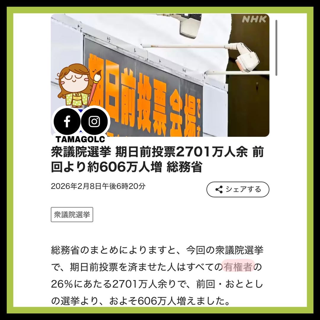 日本總務省公布,日本全國有超過2701萬人已經完成投票,投票人數與上屆選舉和前年相比之下投票人數增加606萬人以上😮,是新紀錄!