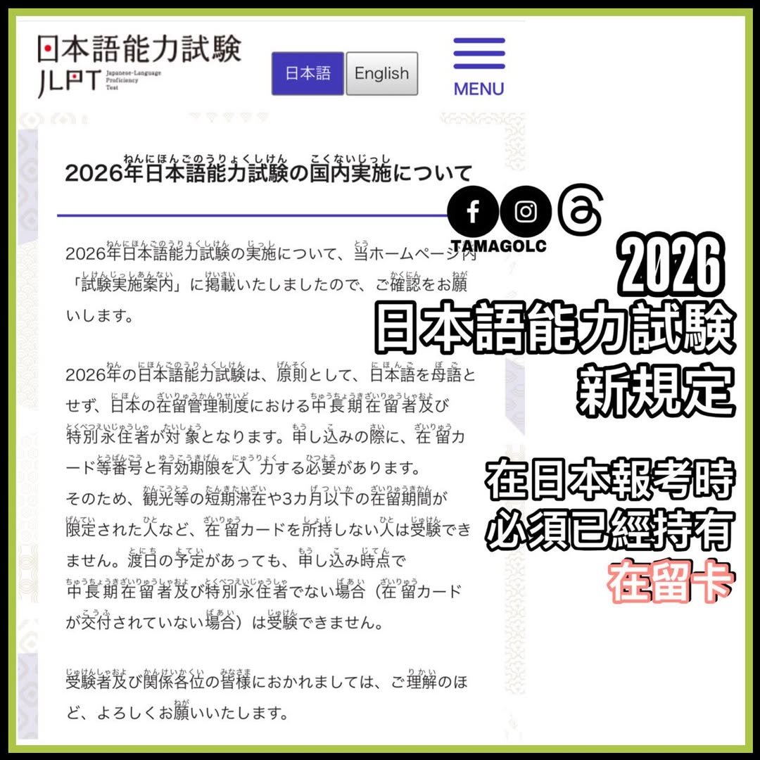由2026年開始,在日本報考日本語能力試驗,提交申請時需要提交有效的在留卡編號,以譬如觀光等簽證的短期停留人士,不符合在日本應試資格。