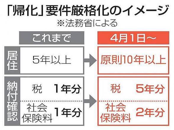 《國籍法》條文仍然維持「5 年以上」,審查實務上將提高門檻至「原則10年以上」,這個執行彈性空間將留給當局。按照之前的發表,對日本有重大貢獻的申請人(譬如奧運金牌選手),主要為評估申請人與日本社會的融合性。